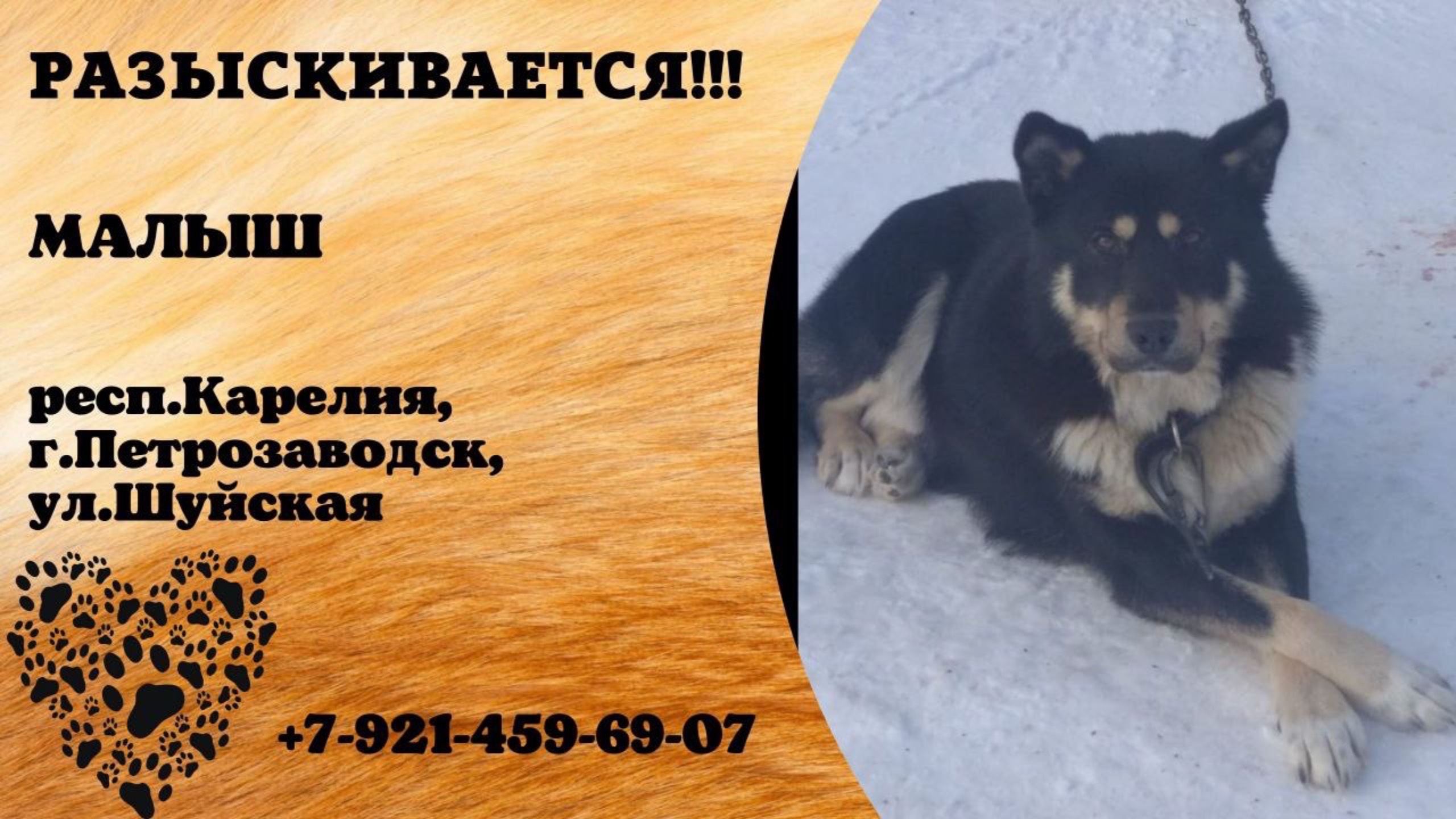 Карелия Петрозаводск Пропала собака 28.01 Друзья, всем привет! У нас убежал пес, в городе, приезжали в ветклинику и он сорвался с поводка. Убежал на шуйской в сторону заводской и первомайского, но может быть и в других районах (сулажгора, октябрьский, пятый поселок, возможно центр). Пес крупный, кличка Малыш. Номер для связи 89214596907 Ирина. Инфо https://vk.com/wall-198815410_174473 Автор vk.com/id9423544 #пропала_собака#Карелия #Петрозаводск