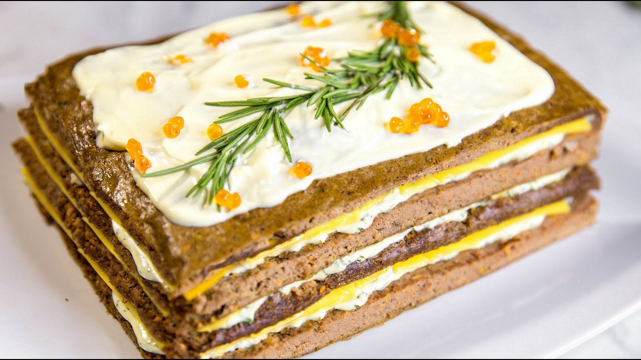 ✳️ ПЕЧЕНОЧНЫЙ ТОРТ Ингредиенты: - 1кг куриной печени - Морковь - 3 яйца - 1ч.л. разрыхлителя - 3ст.л. муки - Зелень - Майонез - Сыр В блендере смешиваем печень, морковь, яйца, разрыхлитель и муку. Солим, перчим и пробиваем до однородной массы. Массу выливаем в противень и отправляем в духовку на 20-25 минут при 180 градусах. Смешиваем нарезанную зелень и майонез. Корж нарезаем на 4 части, каждую смазываем майонезом с зеленью и выкладываем сыр. Складываем их друг на друга, накрываем одним куском коржа сверху, заворачиваем в фольгу и убираем в холодильник на 2-3 часа. Украшаем зеленью и икрой. Весь музыкальный контент, использующийся в видео на данном канале размещён на основании лицензии Creative Commons 4.0 (https://creativecommons.org/licenses/by/4.0/) В видео играет музыка: Автор - Verano Sensual Kevin MacLeod "Verano Sensual" Kevin MacLeod (incompetech.com) Licensed under Creative Commons: By Attribution 4.0 License http://creativecommons.org/licenses/by/4.0/
