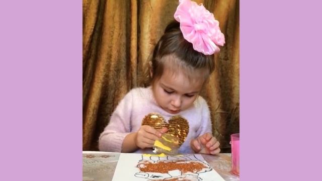 Вика делает поделки с декоративным , блестящим песком .