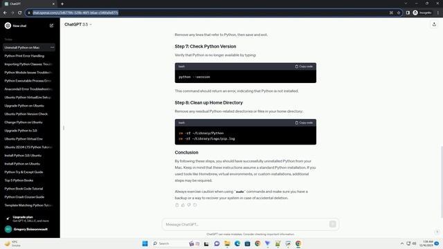 Download this code from https://codegive.com Uninstalling Python from a Mac involves a few steps, and it's important to be cautious to avoid any unintended consequences. Follow the steps below to uninstall Python from your Mac. Note that these instructions assume you have installed Python using the default installer and haven't used third-party tools like Homebrew. Before uninstalling Python, determine which versions are currently installed on your system. Open the Terminal and type the following command: This will list the Python versions installed in the /usr/local/bin directory. Navigate to the /Library/Frameworks/ directory and remove any Python frameworks: Remove any Python applications that might be installed. These are typically found in the /Applications directory: Remove Python binaries and symbolic links from the /usr/local/bin directory: Check and edit your shell profile files (e.g., ~/.bash_profile, ~/.zshrc, or ~/.bashrc) to remove any Python-related lines. Open the file in a text editor and delete or comment out any lines related to Python. Edit the /etc/paths file to remove the path to the Python binaries: Remove any lines that refer to Python, then save and exit. Verify that Python is no longer available by typing: This command should return an error, indicating that Python is not installed. Remove any residual Python-related directories or files in your home directory: By following these steps, you should have successfully uninstalled Python from your Mac. Keep in mind that these instructions assume a standard Python installation. If you used tools like Homebrew, virtual environments, or custom installations, additional steps may be required. Always exercise caution when using sudo commands and make sure you have a backup or a way to recover your system in case of accidental deletion. ChatGPT