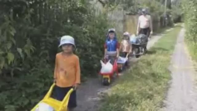 Малыши вывозят мусор на тачках