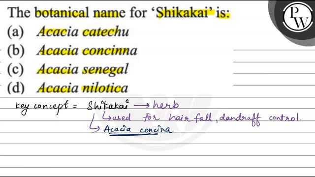 The botanical name for 'Shikakai' is: (a) Acacia catechu (b) Acacia concinna (c) Acacia senegal (d) Acacia nilotica 📲PW App Link - https://bit.ly/PW_APP 🌐PW Website - https://bit.ly/PW_APP 📌 PHYSICS WALLAH OTHER CHANNELS : 🌐 PhysicsWallah -Alakh Pandey: https://youtube.com/@PhysicsWallah 🌐 Alakh Pandey: https://youtube.com/@alakhpandey1414 🌐 JEE Wallah: https://youtube.com/@jee_wallah 🌐 Competition Wallah: https://youtube.com/@competitionwallah 🌐 PW Foundation: https://youtube.com/c/PhysicsWallahFoundation 🌐 NCERT Wallah : https://www.youtube.com/channel/UC8zCnnfhz-dvIpVdZ1CheuA 🌐 Defence Wallah-NDA: https://youtube.com/channel/UC8OCoGX9tmMneOzIFUTWq2Q 🌐 PhysicsWallah English: https://youtube.com/@EnglishPW 🌐 PW Vidyapeeth: https://youtube.com/@VidyapeethPW 🌐 Commerce Wallah by PW: https://youtube.com/@commercewallahpw 🌐 CA Wallah bt PW: https://www.youtube.com/channel/UC2amkJX5zDyQJ0mDajAWRSA 🌐 PW Sarkari Exam: https://youtube.com/@PWSarkariExams 🌐 PW - Hindi Medium: https://youtube.com/@physicswallahhindimedium 🌐 PW Bangla: https://youtube.com/@pwbangla 🌐 PW Maharashtra: https://youtube.com/@PWMaharashtra 🌐 PW Telugu: https://youtube.com/@PWTelugu 🌐 PW Kannada: https://youtube.com/@PWKannada 🌐 PW Gujarati: https://youtube.com/@PWGujarati 🌐 PW Facts: https://youtube.com/@pwfacts 🌐 PW Insiders: https://youtube.com/channel/UCHMWQFr9Nwo3wJsAap2Wnfw 🌐 PW Little Champs: https://youtube.com/@pwlittlechamps 🌐 PW Pathshala: https://youtube.com/channel/UCcXUY9NSMyYbkOvUD97CUmA 🌐 Banking Wallah : https://www.youtube.com/channel/UCg5_K50hLTKerLkSE7I1yWQ 🌐 SSC Wallah : https://www.youtube.com/channel/UCcaEVV7A47J4k9GFcqOOYkg 🌐 JEE Challengers by PW : https://www.youtube.com/channel/UCyf71tWV2abeN-l_UKiJ-5g 🌐 UPSC Wallah : https://www.youtube.com/channel/UCqOy6oOu6RPJNHYQ8f_Ybvg 🌐 UPSC Wallah हिन्दी : https://www.youtube.com/channel/UCmrP-DYdZuThp8AO9lnnwNw 🌐 GATE Wallah : https://www.youtube.com/channel/UC9PoSJoftLvEnXT-PtQ5Wtw 🌐 GATE Wallah - EC,EE & CS : https://www.youtube.com/channel/UCuGWIkiNaWjsCqybgxGuxfg 🌐 GATE Wallah - ME, CE & XE : https://www.youtube.com/channel/UCGrrw9x3_B_fItUIBMvqAUw 🌐 GATE English : https://www.youtube.com/channel/UCOsV75fSUr8gnMbhx-Qh3Lg 🌐 College Wallah : https://www.youtube.com/channel/UCDrf0V4fcBr5FlCtKwvpfwA 🌐 PW IIT JAM & CSIR NET : https://www.youtube.com/channel/UCuj28Zll58sztDqLiDhzgtQ 🌐 MBA Wallah : https://www.youtube.com/channel/UCWWEvCschv0T0rtou4VaKGw 🌐 Teaching Wallah : https://www.youtube.com/channel/UCUzqJZOkCejFoc5eqWWA9Eg 📌 PHYSICS WALLAH SOCIAL MEDIA PROFILES : 🌐 Telegram : https://t.me/pwjeewallah 🌐 Facebook : https://www.facebook.com/physicswallah 🌐 Instagram : https://www.instagram.com/pwjee_wallah/?hl=en 🌐 Twitter : https://twitter.com/physics__wallah 🌐 Linkedin : https://www.linkedin.com/company/78087354/admin/ 📌 For any queries or complaints Visit : https://bit.ly/PW_Queries