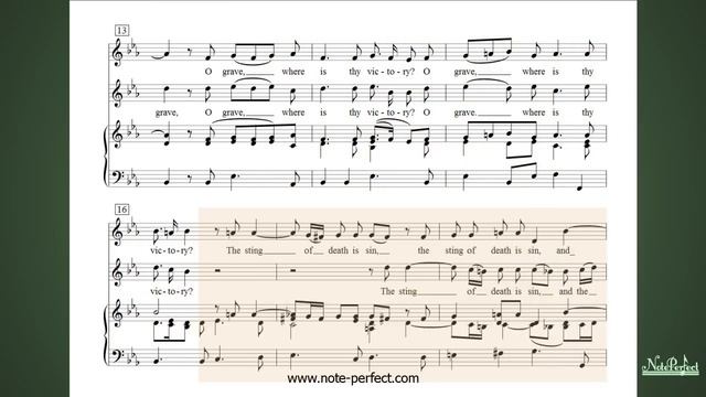 "O death, where is thy sting?" Alto and Tenor Duet Accompaniment from Messiah by George Frideric Handel, with assistance for the soloists. http://note-perfect.com/ Created by Note Perfect, makers of audio choral rehearsal training aids for choirs and soloists. See the web site for a complete list of all the music works produced. You are invited to imbed this video into your web site if you wish. This video and sound track is owned by Note Perfect and is Copyright © 2012 Note Perfect all rights reserved. It must not be re-edited or remastered.