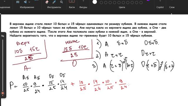 В верхнем ящике стола лежат 10 белых и 15 чёрных одинаковых по размеру кубиков. В нижнем ящике стола лежит 15 белых и 10 чёрных таких же кубиков. Аня наугад взяла из верхнего ящика два кубика, а Оля – два кубика из нижнего ящика. После этого Аня положила свои кубики в нижний ящик, а Оля – в верхний. Найдите вероятность того, что в верхнем ящике по-прежнему будет 10 белых и 15 чёрных кубиков.
