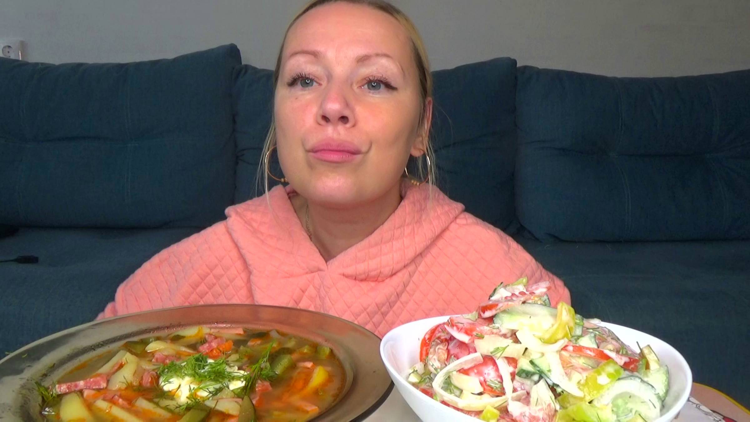 Мукбанг суп солянка кисленький, салат. Еда на камеру.