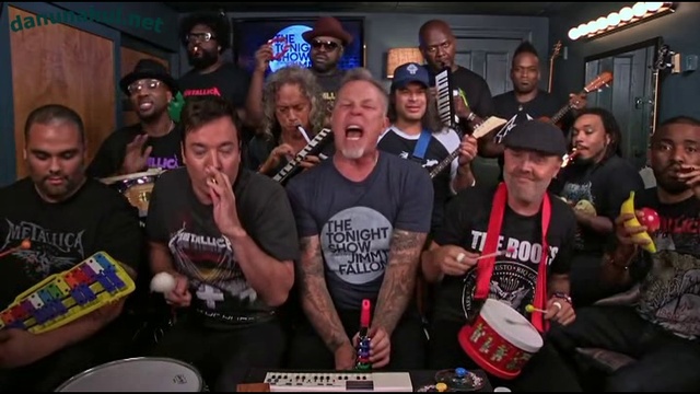 Jimmy Fallon, Metallica & The Roots Sing "Enter Sandman" (Classroom Instruments) Metallica joins Jimmy and The Roots in the Tonight Show Music Room to perform "Enter Sandman" with classroom instruments. Instrument list below: James Hetfield - Vocals, Toy clarinet Jimmy Fallon - Vocals, Bass Drum, Casio Keyboard, Kazoo Lars Ulrich - Fisher Price Drum, Toy Cymbals Kirk Hammett - Melodica Robert Trujillo - Baby Electric Axe Questlove - Hand Clappers, Kazoo Kamal Gray - Xylophone James Poyser - Melodica Captain Kirk - Ukulele Tuba Gooding Jr. - Kazoo, Banana Shaker, Apple Shaker Mark Kelley - Kazoo Frank Knuckles - Bongos Black Thought - Tambourine, Brown Hat