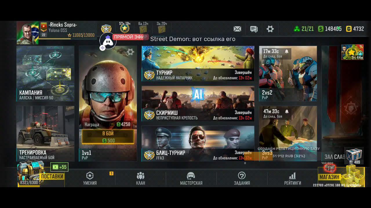 Поддержка автора по ссылке: https://www.donationalerts.com/r/rincks Бланк банк 4375571500040653 телеграм группа для подписчиков https://t.me/art_of_war_3_rincks_sopra Продлить стрим:300 руб Смена фракции:200 руб Тренировка:300 руб 2х2: по совести Покажи кач: миллион рублей Закончить стрим:1000 руб Так же можно заказать челлендж. тоесть дать стримеру задание за определенную сумму. Например: сыграть только авиацией или вообще без неё,ну и так далее. Ссылка на игру: Долго искал настоящую стратежку на телефон, как старкрафт. Наконец нашел Art of War 3! Очень крутая игра! Вот ссылка, качай, тебе понравится: https://redirect.appmetrica.yandex.com/serve/169878688668608468?recruiter_id=1111515909