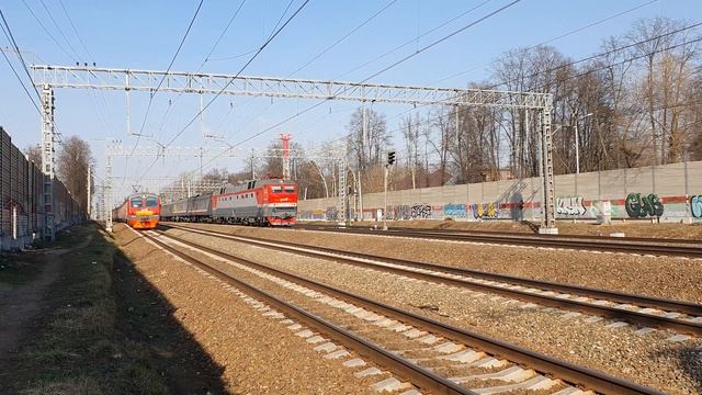 14 апреля 2021 года в 16:15 перегон Мытищи-Лосиноостровская ярославское направление Московская железная дорога electric train and passenger, ED4M-0226 and ChS7-005 with train №375 Vorkuta-Moscow April 14, 2021 at 16:15 section Mytischi-Losinoostrovskaya Yaroslavskoe direction Moscowskaya railway
