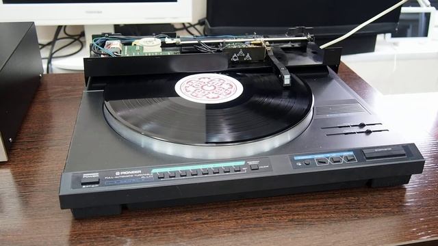 Pioner PL-L77 работа тангенциального тонарма, аппарат со снятой верхней крышкой.