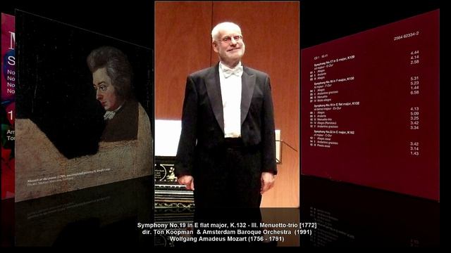 В.А. Моцарт. Все симфонии. Вып. 19-9 Wolfgang Amadeus Mozart (1756 - 1791) – Symphony No.19 in E-flat major, K.132 (1772) Вольфганг Амадей Моцарт (1756 - 1791) – Симфония No.19 ми бемоль мажор, KV 132 (1772) Es-dur ■ en mi bemol majeur ■ ми бемоль мажор I. Allegro [4:13] II. Andante [5:09] III. Menuetto-trio [3:25] IV. Allegro (Rondeau) [3:42] IIa. Andantino grazioso [3:34] dir. Ton Koopman / дир. Тон Копман Amsterdam Baroque Orchestra / Амстердамский барочный оркестр Doopsgezinde Kerk, Haarlem, April 1991 Симфония № 19 ми-бемоль мажор, K.132 написана Вольфгангом Амадеем Моцартом в июле 1772 года. Симфония рассчитана на два гобоя, четыре валторны (две из которых настроены исключительно yf ми-бемоль альто) и струнные. У симфонии четыре части 1. Allegro 4/4 2. Andante 3/8 3. Menuetto – Trio 3/4 4. Allegro 2/2 Первая часть открывается мотивом, который Моцарт позже использует в начале своего двадцать второго фортепианного концерта в той же тональности. Экспозиция краткая и не повторяется. Разработка ориентирована на новый материал. Есть также альтернативная медленная часть, отмеченная Andantino grazioso. Отметки темпа в первой, второй и четвертой частях были написаны рукой Леопольда Моцарта. Финал - французское рондо в семичастной форме (ABACADA). Каждая часть рондо повторяется, за исключением финального “ля”. Тон Копман, (Ton Koopman, полное имя Antonius) (род. 2 октября 1944, Зволле) — нидерландский клавесинист, органист, дирижёр. Крупный представитель движения аутентичного исполнительства. В 1970 окончил Консерваторию Свелинка в Амстердаме как органист (класс Симона Янсена) и клавесинист (класс Густава Леонхардта). Изучал музыкознание в Амстердамском университете. Лауреат международного конкурса клавесинистов в Брюгге (1968). В 1978-88 профессор по классу клавесина в Консерватории Свелинка, с 1988 профессор по классу клавесина в Гаагской консерватории (среди его учеников Масааки Судзуки). В качестве приглашённого дирижёра работал с оркестром Консертгебау, Роттердамским филармоническим оркестром, Оркестром баварского радио (Мюнхен), Кливлендским оркестром, Моцартеум-оркестром в Зальцбурге, Барочным оркестром Евросоюза (EUBO) и др. В 1979 основал и возглавил Амстердамский барочный оркестр, в 1992 Амстердамский барочный хор (современное название «Амстердамский барочный оркестр и хор»). Гастролирует по всему миру (в России впервые в 2008), участвует в международных фестивалях старинной музыки. С 2004 года художественный руководитель и постоянный участник фестиваля старинной музыки «Путеводитель по барокко» (фр. Itinéraire Baroque) в аквитанской провинции Зелёный Перигор (фр. Périgord Vert). В репертуаре Копмана и его коллектива преимущественно барочная музыка (Бах, Гендель, Букстехуде), исполняет также музыку венских классиков. Автор (совместно с К. Вольфом) трёхтомной монографии «Мир баховских кантат» (1998). Выступает в качестве редактора нотных изданий, в том числе органных концертов Генделя (в лейпцигском издательстве Брейткопф и Гертель). В штутгартском издательстве «Carus» подготовил (вместе с Я.Симонсом) издание оратории «Мессия» Генделя, в котором предложил новую орнаментику, и оратории «Страшный суд», приписываемой Букстехуде. C 2004 президент Международного общества Букстехуде Амстердамский барочный оркестр и хор (англ. Amsterdam Baroque Orchestra & Choir) — нидерландский исполнительский коллектив (барочный оркестр и хор), работающий в русле аутентичного исполнительства. Специализируется на музыке эпохи барокко. Коллектив обязан своим возникновением крупному представителю аутен