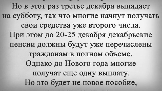 В Декабре Пенсионерам Выплатят 2 ПЕНСИИ! Российским пенсионерам рассказали об особенностях выплаты пенсий в декабре этого года. Многие пожилые граждане смогут получить в грядущем месяце сразу две пенсионные выплаты. Причем одна из них будет больше другой. Ситуация затронет очень многих пенсионеров по всей стране, но это будет не новая выплата, а две пенсии поступят пожилым гражданам в течение месяца из-за особенностей графика. Так, уже в первой половине декабря российские пенсионеры начнут получать свои выплаты за первый зимний месяц. Как правило, процесс перечисления денег пенсионерам стартует с третьего числа. Но в этот раз третье декабря выпадает на субботу, так что многие начнут получать свои средства уже второго числа. При этом до 20-25 декабря декабрьские пенсии должны будут уже перечислены гражданам в полном объеме. Однако до Нового года многие получат еще одну выплату. Но это будет не новое пособие, а пенсия за январь. Дело в том, что из-за новогодних праздников в график перечисления пенсий за январь будут внесены изменения. Первые несколько дней нового года, как правило, являются нерабочими во всех почтовых отделениях. А банки вовсе не работают почти все новогодние каникулы. Поэтому тем, кто привык получать свои пенсии на банковскую карту в начале месяца, выплаты поступят досрочно уже в конце декабря. Примечательно, что вторая пенсия, которая поступит россиянам в декабре, будет больше первой. Ведь выплаты будут приходить уже с учетом январской индексации на 4,8 процента. Но затронет такое повышение только страховые пенсии и только тех граждан, которые нигде официально не работают. Ставьте лайк если считаете, что повышение пенсий должно быть больше и для всех пенсионеров.