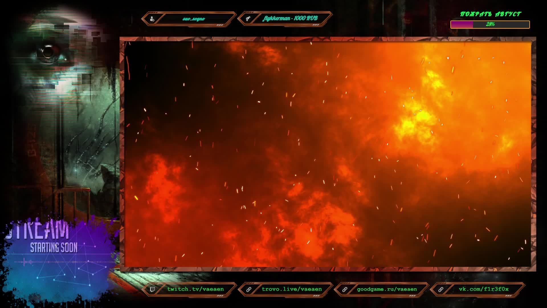 Если хотите поддержать меня как стримера - нажмите по данной ссылке https://www.donationalerts.com/r/f1r3f0x Во время стрима ваше сообщение появится на экране, и будет сопровождаться голосовым диктором. Поддержка на Boosty https://boosty.to/vaeaen Поддержка без комиссии: Сбер: 2202 2010 0629 1039 Тинькофф: 2200 7008 4677 0625 Основные каналы: Twitch: https://www.twitch.tv/vaeaen Trovo: https://trovo.live/Vaeaen GoodGame: https://goodgame.ru/channel/Vaeaen/ VKplay: https://vkplay.live/vaeaen Wasd: https://wasd.tv/vaeaen YouTube: https://www.youtube.com/channel/UCsl3CyRcImUYtWiCgEdvmjQ