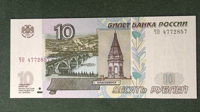 Банкнота 10 рублей 1997 года выпуска имеет следующие основные особенности: на лицевой стороне изображены мост через реку Енисей и часовня в Красноярске, на оборотной стороне - плотина Красноярской ГЭС. Банкнота выполнена на хлопковой бумаге светло-желтого цвета, с водяными знаками, расположенными на купонных полях, и защитной нитью. Преобладающие цвета банкноты - темно-зеленый и темно-коричневый. Существуют модификации банкноты 1997 года, в частности 2001 и 2004 годов, которые отличаются наличием дополнительных защитных элементов и надписей, указывающих на модификацию. #бумажныеденьги #красноярскийкрай #10рублей #1997 #2004 #2001 #енисей #мосты #мост #сторона