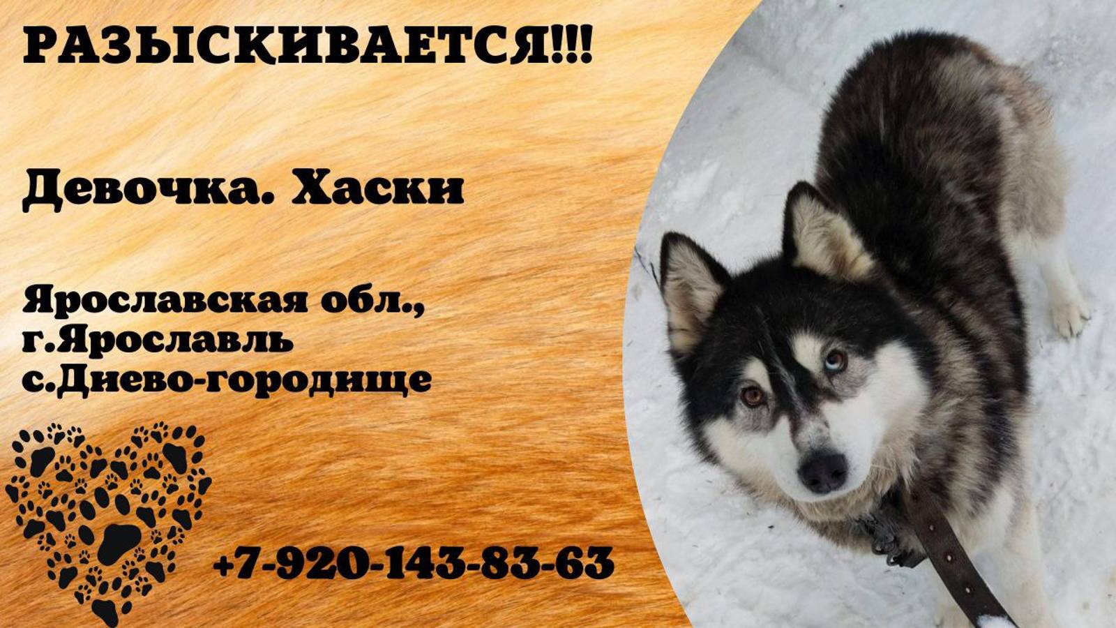 Ярославская Ярославль с.Диево-городище Пропала собака 06.09 Пропала собака хаски, девочка. Убежала в районе села Диево-городище Ярославской области. Собака небольшая, чёрно-белый окрас, глаза разного цвета. Имя хозяина: Мария Телефон: +7 920 143-83-63 Автор https://vk.com/faputta Инфо https://vk.com/wall-198815410_154584
