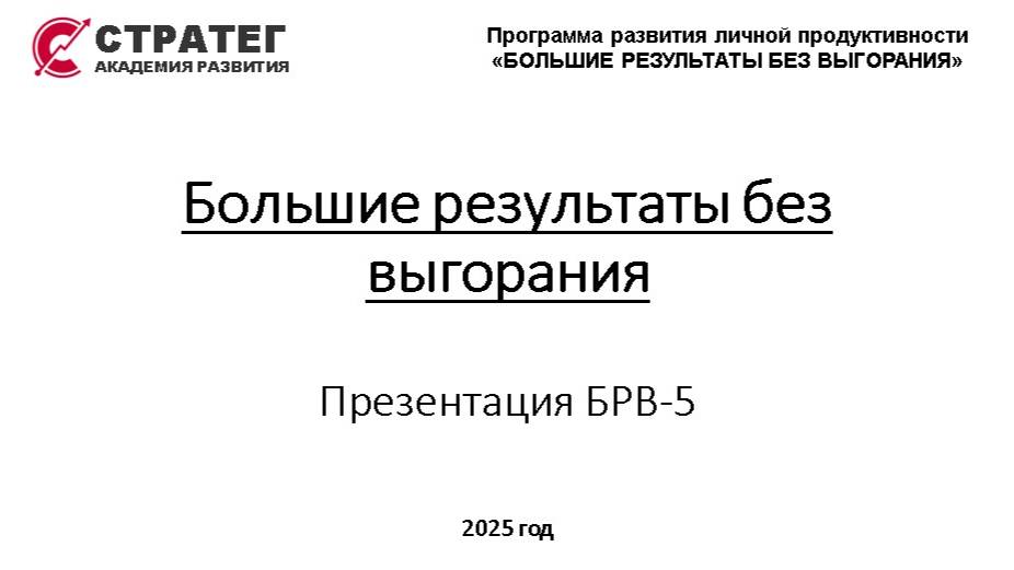 Академия развития "СТРАТЕГ" Презентация Системы БРВ-5 ✅ 02:45 Что такое система БРВ? ✅ 04:04 Зачем осваивать систему БРВ? ✅ 04:39 Образ высокопродуктивного человека ✅ 08:27 Как создавалась система БРВ? ✅ 15:34 Что дает освоение системы БРВ? ✅ 20:26 Этапы формирования ВСЖ* ✅ 30:20 БРВ-База ✅ 30:55 Освоение базовых практик ВСЖ ✅ 33:18 Формирование любви к деятельности ✅ 35:40 Базовые компетенции ВСЖ ✅ 39:39 Что после освоения системы БРВ? ✅ 44:42 Концепция благополучия "Три Капитала" ✅ 47:57 Условия участия в программе сопровождения освоения системы БРВ-5 ✅ 57:42 Короткое резюме *ВСЖ - Высокопродуктивный Стиль Жизни