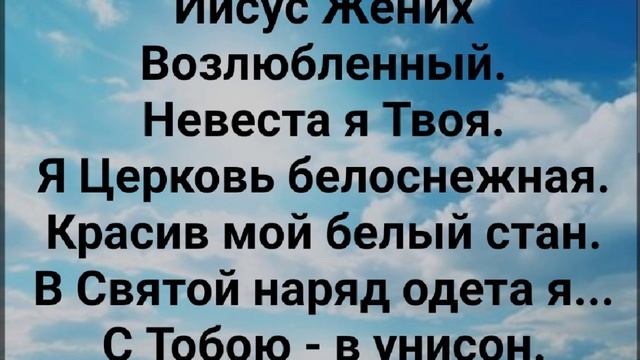 ХРИСТИАНСКИЕ ПЕСНИ ДЛЯ ХВАЛЫ И ПОКЛОНЕНИЯ ПРОСЛАВЛЕНИЯ ВООДУШЕВЛЕНИЯ ЕВАНГЕЛИЗАЦИИ #господь#музыка#христианская_музыка#музика#христианскиепесни#бог#христианскиестихи#любовь#христианство#стихи#песня#песни#иисус#иисусхристос#иисусмойбог#иисус_христос#иисусбог#иисусгосподь#хвалы_и_поклонения#хваление#хвала#прославление "ИИСУС - ЖЕНИХ ВОЗЛЮБЛЕННЫЙ!" СЛОВА, МУЗЫКА: ЖАННА ВОЛКОВА-ВАРЛАМОВА Стихи Жанна Волкова(Варламова) Припев: Ну где же Ты, Возлюбленный? Тебя хожу гляжу. В ночи, в тиши взываю я. И утром встречи жду. Иисус - Жених Возлюбленный.. Ты голубь белый мой. Меня Ты успокой сейчас. Я дверь Тебе открою. Ты сил мне дай, о, Боже мой И душу обогрей. Припев: Ну где же Ты, Возлюбленный? Тебя хожу гляжу. В ночи, в тиши взываю я. И утром встречи жду. Иисус - Жених Возлюбленный... Ты голубь белый мой. Меня Ты успокой сейчас. Я дверь Тебе открою. Ты сил мне дай, о, Боже мой... И душу обогрей. Припев: Ну где же Ты, Возлюбленный? Тебя хожу гляжу. В ночи, в тиши взываю я. И утром встречи жду. Иисус - Жених Возлюбленный... Невеста я Твоя. Я Церковь белоснежная. Красив мой белый стан. В Святой наряд одета я... С Тобою - в унисон. Припев: Ну где же Ты, Возлюбленный? Тебя хожу гляжу. В ночи, в тиши взываю я. И утром встречи жду. Иисус - Жених Возлюбленный... Невеста я Твоя. Я Церковь белоснежная. Красив мой белый стан. В Святой наряд одета я... С Тобою - в унисон. Припев: Ну где же Ты, Возлюбленный? Тебя хожу гляжу. В ночи, в тиши взываю я. И утром встречи жду. Иисус - Жених Возлюбленный... Невеста я Твоя. Я Церковь белоснежная. Красив мой белый стан. В Святой наряд одета я... С Тобою - в унисон. 10..03.2019 Жанна Волкова-Варламова
