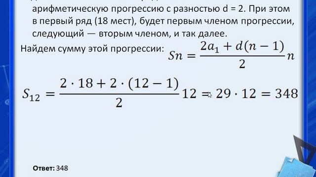 В амфитеатре 12 рядов. В первом ряду 18 мест, а в каждом следующем на 2 места больше, чем в предыдущем. Сколько всего мест в амфитеатре? В амфитеатре 11 рядов. В первом ряду 17 мест, а в каждом следующем на 3 места больше, чем в предыдущем. Сколько всего мест в амфитеатре?