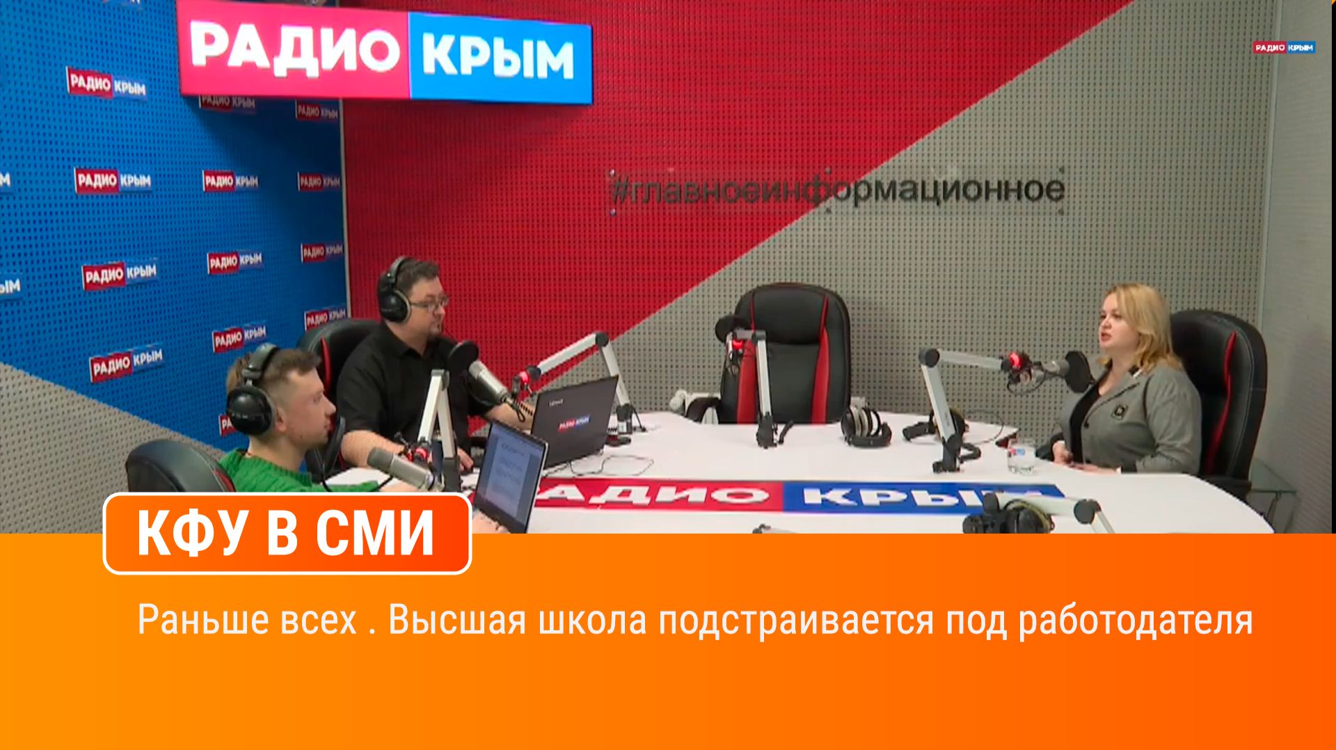 Радио «Крым». В эфире – проректор по учебной и методической деятельности КФУ им. В.И. Вернадского Наталья Кармазина. Тема эфира – «Раньше всех». Высшая школа подстраивается под работодателя.