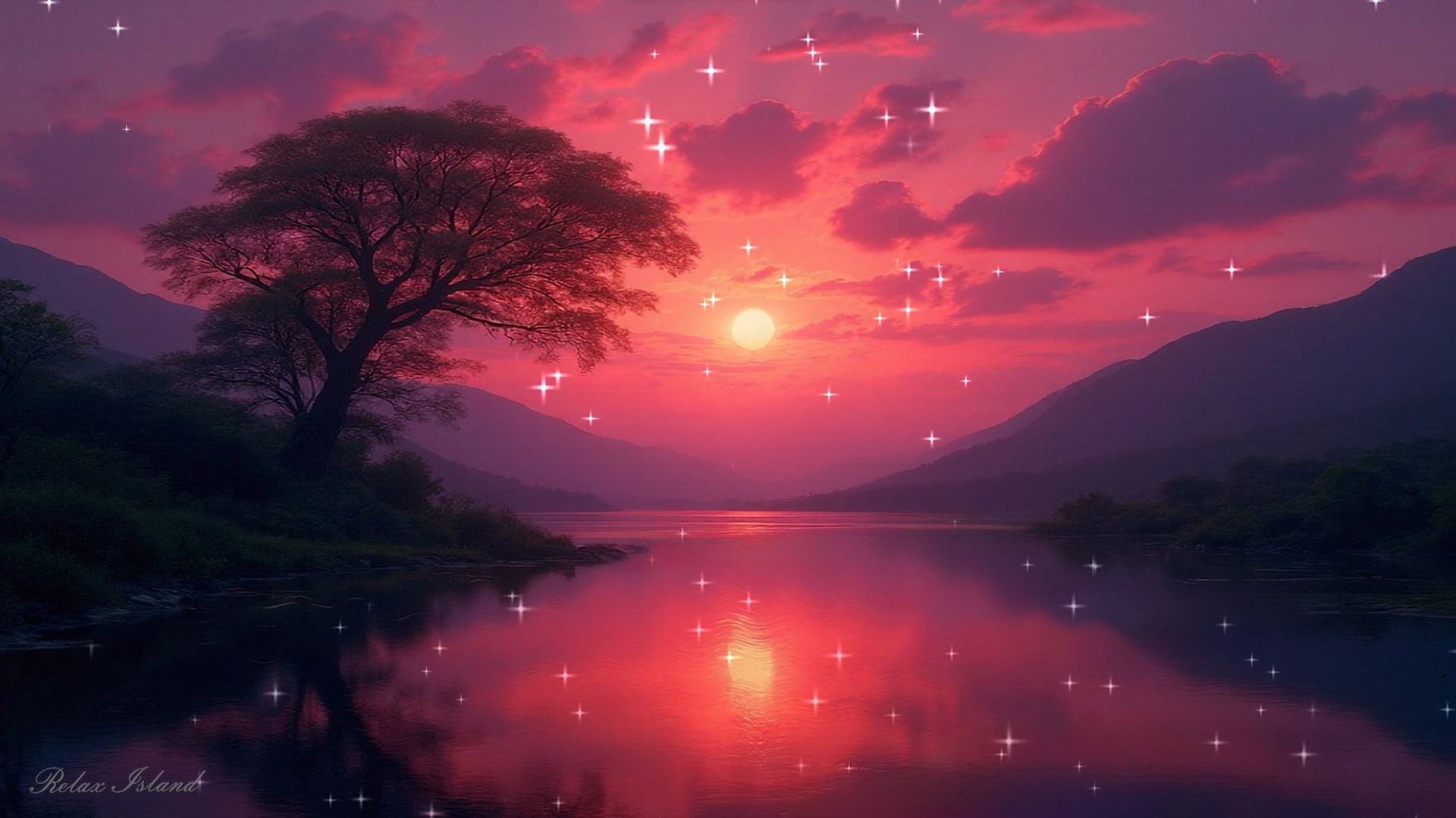 Чарующая медитативная успокаивающая музыка для сна и восстановления нервной системы на берегу озера на закате дня! Хорошо расслабляющая музыка для души в лучах заката под кроной дерева на берегу после жаркого дня! Большое озеро у подножия гор, багровый закат, первые звёзды на небе, медленно проплывают облака, стайки птиц пролетают на озером и медленная музыка для медитации создают идеальную атмосферу для релаксации! После жаркого дня воздух у воды становится мягче и прохладнее. Лёгкий ветерок проходит по поверхности озера, поднимая спокойную рябь, и эта рябь ловит багровые лучи заката, превращая воду в живое полотно из меди и золота. У подножия гор уже сгущаются длинные тени, но небо ещё держит тепло — оно светится насыщенными оттенками, которые меняются медленно, как дыхание. Вы устроились под кроной дерева у самого берега. Листья над головой тихо шуршат, пропуская сквозь себя последние солнечные лучи, и свет ложится на землю пятнами — тёплыми, мягкими. Здесь легко закрыть глаза и почувствовать, как день наконец отпускает: плечи расслабляются, лоб становится спокойнее, а мысли перестают цепляться одна за другую. Над озером медленно проплывают облака — плавные, растянутые, словно их несёт невидимая река в небе. Иногда облако на мгновение заслоняет яркую полосу заката, и тогда краски становятся глубже, тише. А затем свет возвращается, и всё вокруг снова окрашивается в багрянец, как будто мир на несколько минут становится особенно добрым и красивым. Вдалеке слышны птицы. Стайка проходит над водой низко и ровно, отражаясь в озере темными штрихами. Их крики короткие, спокойные, как знак того, что день завершён правильно, и природа знает: сейчас время возвращаться в гнёзда, в тишину, в отдых. За ними появляется ещё одна стайка — и небо будто оживает на мгновение, чтобы потом снова стать спокойным и просторным. Медитативная музыка звучит неторопливо, с мягкими протяжными оттенками. Она будто собирает воедино всё, что вы видите: горы, воду, вечерний ветер, уходящее солнце. В этой музыке нет резких переходов — только плавные волны, как на озере. Ноты появляются и растворяются, оставляя после себя ощущение ровности и покоя. Первые звёзды начинают проступать на небе. Сначала одна — яркая, уверенная, затем рядом ещё несколько, и вскоре они складываются в знакомые узоры. С каждым новым огоньком в небе становится яснее: день закончился, и дальше будет ночь — тёплая, спокойная, восстановительная. Вы слушаете музыку и замечаете, как выравнивается дыхание. Вдох — медленный, прохладный, наполненный запахом воды и травы. Выдох — длинный, тёплый, и вместе с ним уходит напряжение, накопившееся за день. Тело словно вспоминает, что умеет отдыхать без усилий: кисти становятся мягче, спина удобнее, сердце бьётся ровно и спокойно. Закат постепенно темнеет. Багровый цвет переходит в глубокий пурпур, затем в сине-фиолетовый, и в этих оттенках появляется особая тишина. Озеро темнеет тоже, но в нём ещё держится тонкая дорожка света — последняя, самая нежная. Она тянется к вашему берегу, как приглашение остановиться, замедлиться, ничего не требовать от себя. Музыка становится ещё более спокойной — как будто теперь она не ведёт, а просто поддерживает. Каждая нота — мягкая опора. Каждая пауза — пространство, в котором можно отпустить мысли. И вы чувствуете, как 