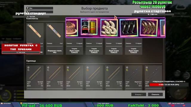 Поддержка донатом https://new.donatepay.ru/@1032463 Альтернативный донат https://www.donationalerts.com/r/kalyamba11 5536913964533059 карта Тинькоф Если стрим лагает,смотри стрим на трово https://trovo.live/s/Kalyamba_na_Ribalke Мой ВК - https://vk.com/kalyantv НИК в игре kalyan11 НАШ ДИСКОРД СЕРВЕР https://discord.gg/QhtSPKp3 Заказ водоема на 1 час - 500р ( весь стрим 2500р ) Модерка на канале 1200р ( каждая следующая на 100р больше) Озвучка доната на 40р,50р,100р,200р,300р,500р,1000р ✅Призы в рулетке "ЗОЛОТАЯ" ✔ ЗОЛОТО ✔ ПРЕМ ✔ КАТУШКИ РАПТОР 40, АЗИМУТ 10000, СИЛЬВЕР 80, ТАЙГА с 30 ✔ ПАЛКИ ПИЛКЕРНАЯ, ДОНКА МОРСКИЕ, ✔ РОД ПОД, СТУЛЬЯ ✅Призы в рулетке СТАНДАРТ : ✔ катушка "РАПТОР 40" ✔ катушка "АЗИМУТ 10000" ✔ катушка "ТАЙГА С30, С40," ✔ катушки 60 для медного ( ЭВИИ, НАТОРЫ, ГОЛДА, и тд) ✔ ПИЛКЕРНОЕ УДИЛИЩЕ КОРОЛЕВА ОКЕАНА ✔ Морское Донное удилище ✔ прем ( 3, 7, 30 дней) ✔ золото ( 1, 3, 5, 10, 20 ,50) ✔ билет на море ( 1, 3, 5 дней) ✔ голд наживка и др. ✅Призы в рулетке "СТАРТОВАЯ" ✔ катушка "silver80" ✔ катушка "БЕЛЫЙ КАЛИБР" ✔ катушка "Черный калибр" ✔ катушка "Протон" ✔ катушка "Нарга 6000" ✔ Набор Фидерист и спинингист ✔ Карповик Фортуна ✔ фидерные удилища ✔ прем, золото, алкашка, наживки и тд P.s Рулетка это не казино, а награда за поддержку стримера. Вечный ТОП ПОДДЕРЖКИ (11.05.2024) 1. Dimon_pokemonchik 119 784 2. Interceptor 75 508 3. Skreb79 71 261 4. une personne 68 619 5. Нарвал77 31 550