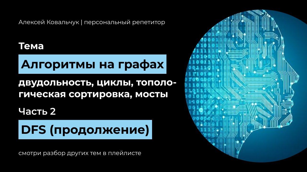 Учи алгоритмы вместе со мной! Ссылка на курс: https://stepik.org/a/184350 Мои курсы по изучению Python: 1. Python - ПОЛНЫЙ КУРС (часть 1): https://stepik.org/course/174852 2. Python - ПОЛНЫЙ КУРС (часть 2): https://stepik.org/a/186192 *** Все курсы на Stepik: https://stepik.org/users/623224055 *** Рекомендую подписаться на открытый канал. В нем обсуждаем стажировки, программирование и многое другое, а также там я в первую очередь делаю все анонсы: https://t.me/analitiqtutor *** Прокачивай себя вместе со мной! Записаться на занятия можно здесь: Написать в Telegram: https://t.me/analitiqq Написать в ВК: https://vk.com/analitiqvk *** Таймкоды: 00:00 Проверка графа на двудольность 14:32 Поиск цикла в ориентированном графе 21:44 Топологическая сортировка 32:27 Поиск мостов *** Теги: #алгоритмы #программирование #python *** Продолжаем разбор алгоритма DFS (поиск в глубину). В этом видео разбираем, как определять является ли граф двудольным, содержит ли циклы. Также обсуждаем вопрос топологической сортировки и поиска мостов в графе. *** Полезные ссылки: Все коды по графам: https://github.com/blacksmithalex/graph https://neerc.ifmo.ru/wiki/index.php?title=Формула_Эйлера https://neerc.ifmo.ru/wiki/index.php?title=Основные_определения_теории_графов https://neerc.ifmo.ru/wiki/index.php?title=Использование_обхода_в_глубину_для_поиска_мостов