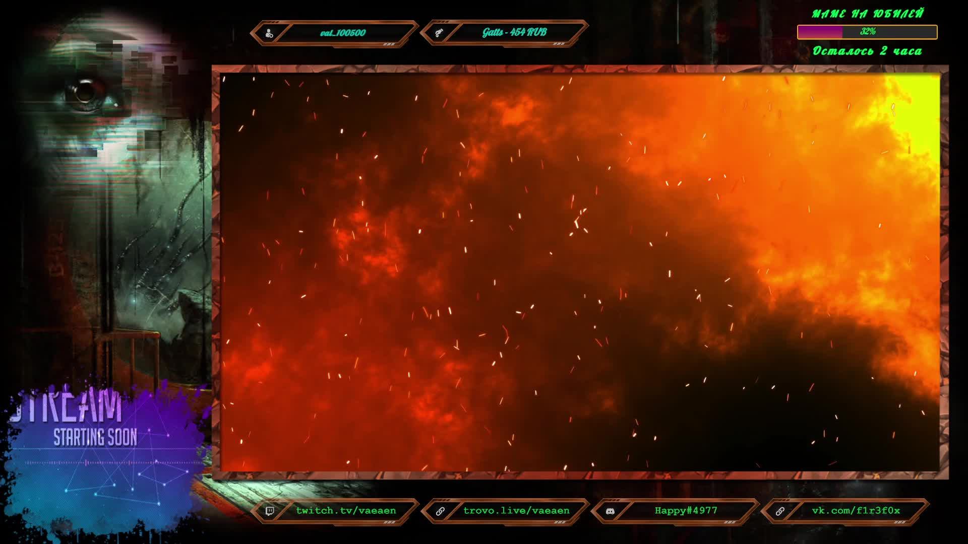 Если хотите поддержать меня как стримера - нажмите по данной ссылке! https://www.donationalerts.com/r/f1r3f0x Во время стрима ваше сообщение появится на экране, и будет сопровождаться голосовым диктором. Поддержка на Boosty - https://boosty.to/vaeaen Поддержка без комиссии: 2202 2010 0629 1039 Основные каналы: Twitch: https://www.twitch.tv/vaeaen Trovo: https://trovo.live/Vaeaen GoodGame: https://goodgame.ru/channel/Vaeaen/