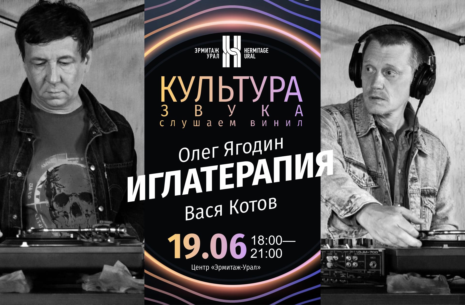 2022.06.19, Центр «Эрмитаж-Урал» (Вайнера, 11 (2 этаж, кофейня)) == Весь вечер будем слушать культовые хиты оркестров прошлого на виниловых пластинках. Первый выпуск «Культуры звука» начинаем с музыкального проекта «Иглатерапия». Иглатерапия — это проект двух уральских музыкантов Олега Ягодина и Васи Котова, посвящённый винилу. Как заявляют сами музыканты: «Всё, что выпущено на виниле, автоматически попадает в музыкальный рай». == ИГЛАТЕРАПИЯ: Василий Котов Олег Ягодин == стрим: Алексей Арпишкин звук: Александр Ровда камера: Виталий Маслов фотограф: Максим Гужавин