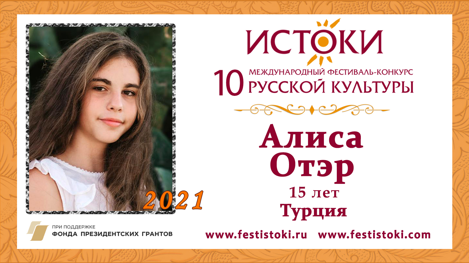 Участница Юбилейного X Международного фестиваля-конкурса русской культуры "Истоки". Сайт: www.festistoki.ru / www.festistoki.com E-mail: festistoki@mail.ru