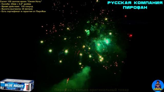 https://avito.ru/brands/PiroFan - ОФИЦИАЛЬНЫЙ магазин Русской компании ПироФан Салют 200 залпов ярких, фейерверк Синяя Ночь - Калибр: 20мм = 0,8" дюйма - Время действия: 105 секунд - Высота выстрела: 25 метров - Есть сертификат и гарантия от ПироФан