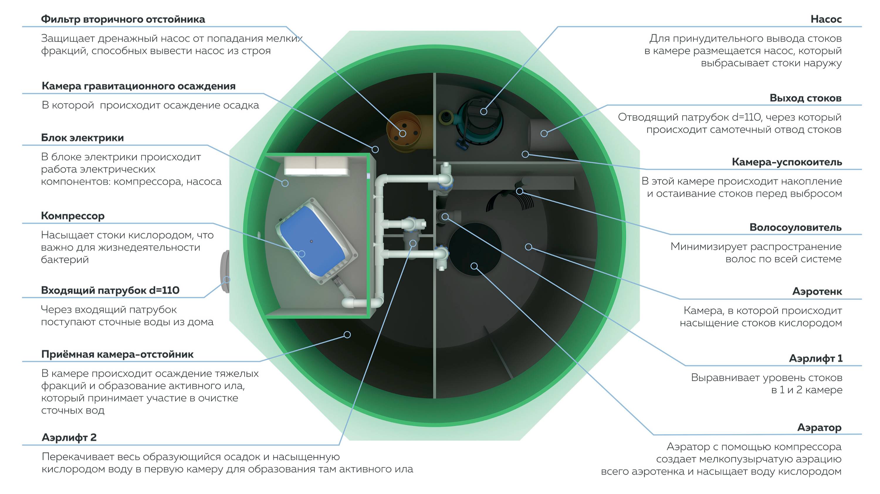 Станция глубокой очистки «Заубер» выполнена из высококачественного листового европейского полипропилена в вертикальном круглом корпусе, что обеспечивает значительное сокращение занимаемого пространства на участке. Модель «Заубер 5» рассчитана на обслуживание пяти человек и способна перерабатывать до 1000 литров сточных вод в сутки. «Заубер» обладает высокой устойчивостью к перепадам напряжения и может быть установлен в любой тип грунта. Отсутствие быстро засоряемых аэролифтов делает его по-настоящему надёжным и удобным решением для частного дома. Преимущества станции: Минимум места на участке. Полная переработка всех хозяйственно-бытовых отходов. Полное отсутствие неприятных запахов. Очистка стоков до 98%. Не требует пескоцементной обсыпки. Удобное и экономичное обслуживание станции. Подходит для постоянного и сезонного проживания. Очищенную воду можно сбрасывать в грунт. Основные отличия от аналогов: Надежные компрессоры и немецкие насосы. Полная энергонезависимость. Станция самотечного типа «Заубер» продолжает функционировать в течение двух дней после отключения электричества, а затем переходит в режим работы септика. Автономная канализационная система. Не требует частых вызовов ассенизаторской машины. Самотечное перемещение стоков. Внутри станции отсутствуют узкие переливные трубки, которые подвержены засорам. Для использования станции в самотечном режиме (стоки выводятся из станции самостоятельно через выходящий патрубок диаметром 110 мм) необходимо установить отводящий патрубок диаметром 110 мм. При принудительном режиме (стоки выводятся с помощью дренажного насоса через выходящий патрубок диаметром 32 или 25 мм) также требуется врезать отводящий патрубок. +79037251728 +79037551728 +79035081728 прием заявок Для отправки заявки при помощи почты Укажите адрес samsonoff.help@mail.ru Либо https://t.me/SamsonoffHelpBot