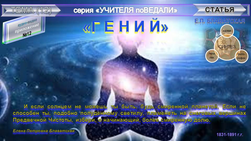 12-й аудио-видио том, из серии "Учителя поВедали", в которую входят аудио-видио тома, составленные и (или) скомпонованные Небесной Нитью на разные заданные темы из Записей воплощенных Учителей Земли. В данную заданную тему вошла соответствующая статья Е.П. Блаватской, названная "ГЕНИЙ". "Синтез науки, религии и философии" - так обозначила суть своих трудов сама Елена Петровна Блаватская (1831-1891 г.г.) - великая наша соотечественница (урожденная Ган в г. Екатеринослав Российской империи, позднее переименованный г. Днепропетровск УССР, ныне в г. Днепр Украина), - стоявшая у истоков экстраординарного мировоззрения, основательница Теософского Общества (1875 Нью-Йорк).