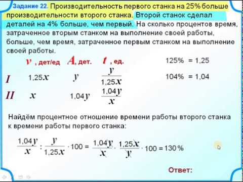 8 класс. Алгебраический способ. Производительность первого станка на 25% больше производительности второго станка. Второй станок сделал деталей на 4% больше, чем первый. На сколько процентов время, затраченное вторым станком на выполнение своей работы, больше, чем время, затраченное первым станком на выполнение своей работы.