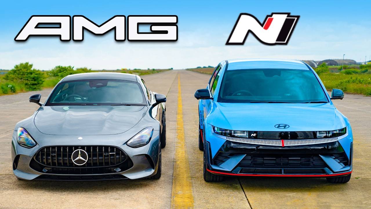 Абсолютно новый Hyundai IONIQ 5 N ВЕРНУЛСЯ, и на этот раз он соревнуется со всемогущим AMG GT! Так давайте сравним эти 2 автомобиля. Начнём с Hyundai, он оснащен двумя электродвигателями, которые в совокупности выдают невероятные 650 л. с. и 740 Нм крутящего момента. Учитывая два двигателя, он поставляется с полным приводом, но большая батарея увеличивает вес машины аж до 2235 кг! Однако вся эта мощность обходится относительно дешево, IONIQ 5 N стоит от 65 000 фунтов. Далее идёт AMG. Он оснащен 4-литровым V8 с двойным турбонаддувом, который может выдавать 585 л. с. и 800 Нм крутящего момента. Мощность передается на все четыре колеса через 9-ступенчатую автоматическую коробку передач, и он немного легче IONIQ, его вес составляет 2130 кг. Однако он НАМНОГО дороже Hyundai, его стоимость составляет около 165 000 фунтов! Так что вы думаете — сможет ли Hyundai тягаться с этим тяжеловесом AMG? Есть только один способ узнать… ПОГОНЯЕМСЯ!