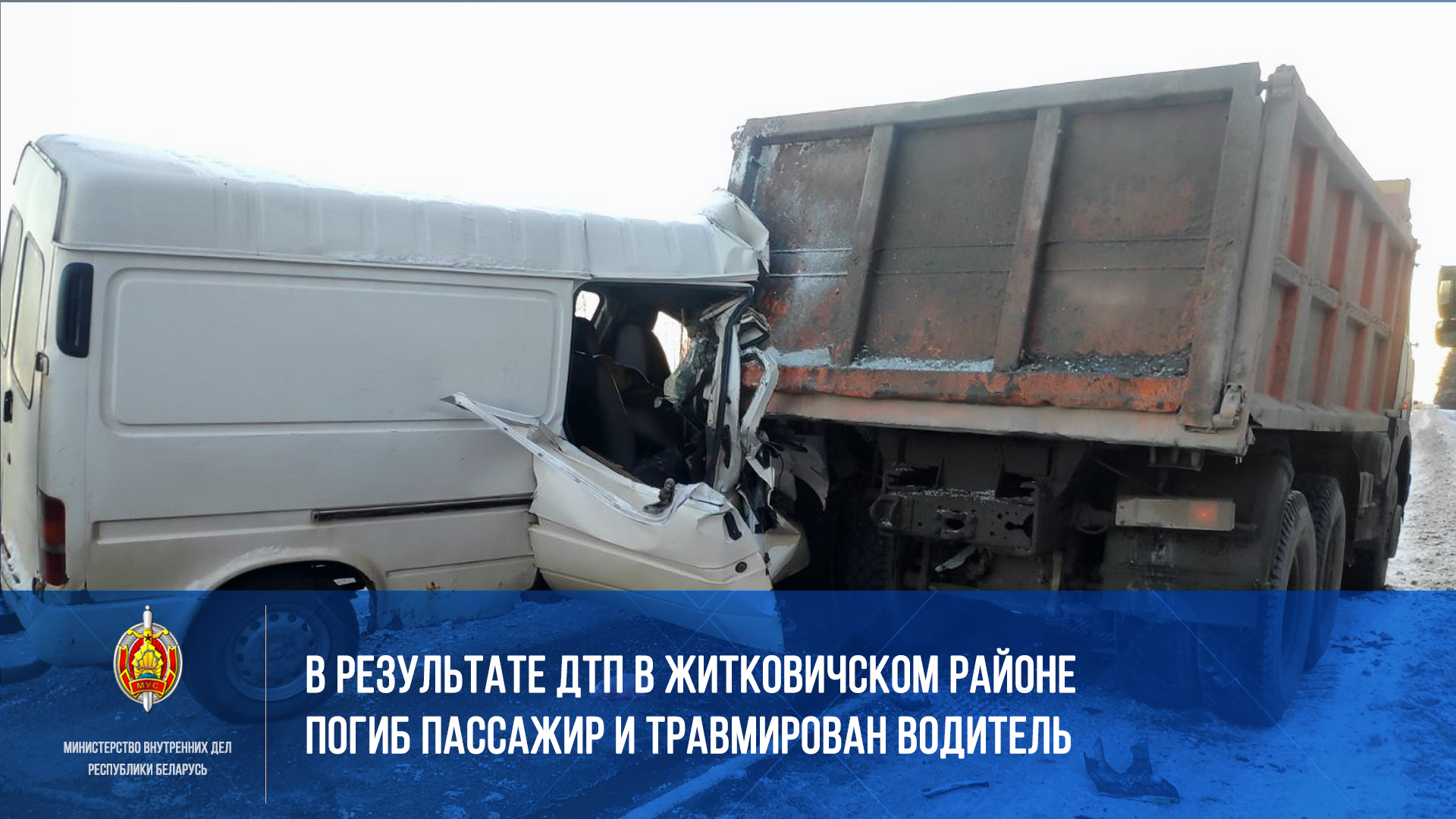 11.01.2022 примерно в 16:10 47-летний водитель, управляя автомобилем «Форд Транзит», двигался на 10 км автодороги Р-88 «Житковичи – Давид Городок – граница Украины» в направлении деревни Борки Житковичского района. В пути следования, по предварительной информации, был ослеплен солнцем, вследствие чего, потерял контроль над управлением транспортным средством и совершил столкновение с движущимся в попутном направлении автомобилем «МАЗ» под управлением 52-летнего водителя. В результате ДТП 50-летний пассажир автомобиля «Форд Транзит» от полученных травм скончался на месте происшествия, а его водитель – с травмами доставлен в больницу.