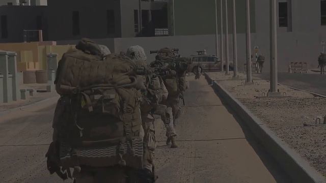 A United Arab Emirate Presidential Guardsman and U.S. Marines engage in a crisis response exercise in the UAE, Jan. 13, 2021. The regularly scheduled exercise was designed to sustain proficiency and enhance MAGTF integration in a realistic training environment. The Special Purpose Marine Air-Ground Task Force – Crisis Response – Central Command is a crisis response force, prepared to deploy a variety of capabilities across the region. (U.S. Marine Corps photo by Cpl. Robert Kuehn)