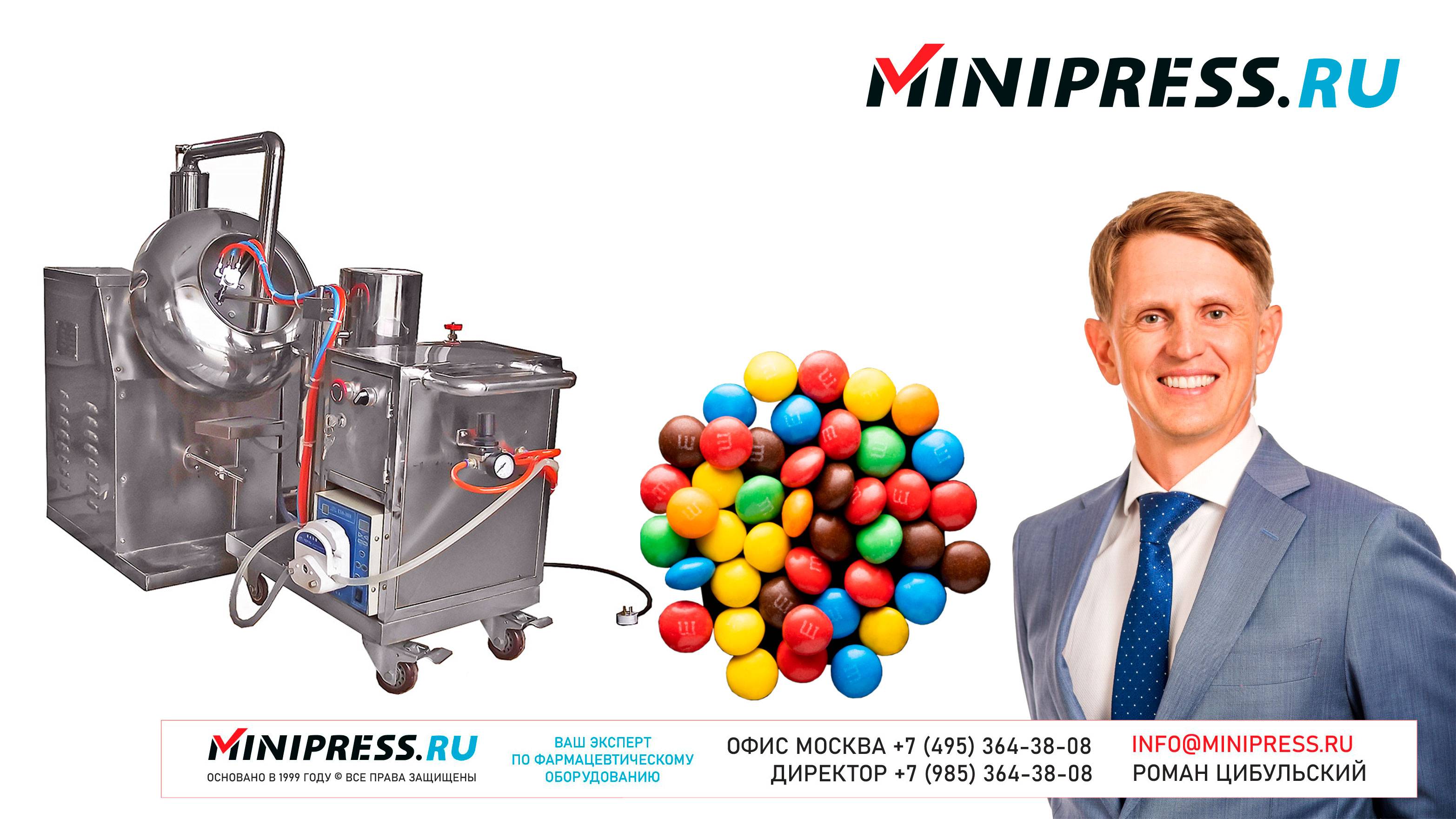 Дражировочный котел DK-42 https://Minipress.ru/katalog/ Фармацевтическое оборудование. Специалисты в фармацевтическом оборудовании и технологиях производства лекарств. Более 20 лет оказываем нашим клиентам помощь в выборе, поставке, наладке различного фармацевтического оборудования! Вы в поиске надежного поставщика оборудования? Мы предоставим вам лучший сервис 24/7. Собрана лучшая команда профессионалов в фармацевтической отрасли и налажены стабильные связи с лучшими производителями. Мы не только продаем, но и производим многие модели оборудования Директор компании Минипресс Роман Цибульский Поставка фармацевтического оборудования в Россию Пишите: info@minipress.ru Телефон +7(495)364-38-08; Мобильный +375(29)308-00-00 Россия, Москва Skype: RomanTsibulsky; ICQ: 310-134-490 Подписывайтесь на наш видео канал на Youtube https://youtube.com/user/wwwMinipressru Обновленный сайт https://Minipress.ru Каталог оборудования https://Minipress.ru/katalog/ МЫ В СОЦИАЛЬНЫХ СЕТЯХ G+ https://plus.google.com/+RomanTsibulsky/ FB https://facebook.com/roman.tsibulsky YOUTUBE https://youtube.com/user/wwwMinipressru IN https://ru.linkedin.com/pub/roman-tsibulsky/a6/933/661 БОЛЬШОЙ КАТАЛОГ ФАРМАЦЕВТИЧЕСКОГО ОБОРУДОВАНИЯ https://minipress.ru/katalog/ Постоянно обновляемый каталог различного фармацевтического оборудования с фотографиями, описаниями, видео и ценами. ПЕРСОНАЛЬНЫЙ МЕНЕДЖЕР 24 ЧАСА https://minipress.ru/katalog/ Вы общаетесь по всем вопросам, с момента первой консультации и до получения оборудования, с одним специалистом. СПЕЦИАЛИСТЫ И ТЕХНОЛОГИ https://minipress.ru/katalog/ Имеем обширные связи в фармацевтической среде, найдем любого специалиста, поможем с освоением оборудования и технологий. ОБСУЖДЕНИЕ ВАШИХ ИДЕЙ ПО ПРОИЗВОДСТВУ ПРОДУКЦИИ https://minipress.ru/katalog/ Поможем в оценке ваших идей. Большой опыт в организации различных производств и выпуске продукции. Ценные советы. ФАРМАЦЕВТИЧЕСКОЕ ОБОРУДОВАНИЕ Мы поставили перед собой задачу, помогать нашим клиентам в правильном выборе фармацевтического оборудования. Многолетний опыт подобной деятельности показывает, что многие клиенты сталкиваются, в первую очередь, с непониманием технологического процесса. Покупка оборудования должна быть финальной точкой после подробного обсуждения задачи, консультацией с производителем оборудования, отправкой сырья и материалов на фабрику, тестирования в работе. ДЛЯ ТАБЛЕТОК https://minipress.ru/katalog/category/farmacevticheskoe_oborudovanie/ Смешивание порошков, гранулирование, прессование, обеспыливание, покрытие оболочками, фасовка, упаковка, счет, нанесение логотипов ДЛЯ ЖЕЛАТИНОВЫХ КАПСУЛ https://minipress.ru/katalog/category/farmacevticheskoe_oborudovanie/kapsulyatory-dlya-tverdyh-zhelatinovyh-kapsul/ Фасовка порошков и масел, обеспыливание, счет и фасовка, упаковка, нанесение логотипов. ФАСОВКА И УПАКОВКА https://minipress.ru/katalog/category/upakovochnoe_oborudovanie/ Упаковка в пластиковые и стеклянные флаконы, блистер, фольгу, ламинированную бумагу, стеклянные ампулы, саше, стрипы, тубы, тюбики, контурную ячейку. ТЕХНОЛОГИЧЕСКОЕ https://minipress.ru/katalog/category/eksperimentalnoe-oborudovanie/ Лабораторное, аналитическое, подготовительное, отдельные машины и линии под ключ. СФЕРЫ ДЕЯТЕЛЬНОСТИ Наша компания занимается множеством направлений фармацевтического бизнеса! Предлагаем Вам посетить страницы нашего сайта https://www.Minipress.ru по различным специализациям. ОБОРУДОВАНИЕ ДЛЯ НАКЛЕЙКИ ЭТИКЕТОК НА БУТЫЛКИ АМПУЛЫ ФЛАКОНЫ https://minipress.ru/katalog/oborudovanie-s-otzyvami/oborudovanie-dlya-naklejki-etiketok-na-butylki-ampuly-flakony/ Автоматическое этикетировочное оборудование для этикеток на клеевой основе БЛИСТЕРНЫЕ МАШИНЫ ДЛЯ УПА