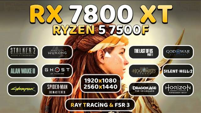 AMD RX 7800 XT + Ryzen 5 7500F | Test in 16 Games | 1080p, 1440p, Ray Tracing, FSR 3 =======(Timestamps)======= 0:00 7500F + 7800 XT 0:42 Hellblade 2 - 1080P 1:53 Hellblade 2 - 1440P 2:59 Hellblade 2 - 1440P FSR 4:02 Banisher Ghost of New Eden - 1080P 5:05 Banisher Ghost of New Eden - 1440P 6:13 Alan Wake 2 - 1080P 7:23 Alan Wake 2 - 1080P RT/FSR 8:51 Alan Wake 2 - 1440P 10:05 Counter Strike 2 - 1080P 11:15 Counter Strike 2 - 1440P 12:26 Cyberpunk 2077 - 1080P 13:40 Cyberpunk 2077 - 1440P 14:42 Cyberpunk 2077 - 1440P FSR/RT/FG 15:50 Ghost Of Tsushima - 1080P 17:18 Ghost Of Tsushima - 1440P 18:45 BlackMyth Wukong - 1080P 20:01 BlackMyth Wukong - 1440P 21:12 BlackMyth Wukong - 1440P FSR 22:26 BlackMyth Wukong - 1440P FSR/FG 23:35 Last Of US Part I - 1080P 24:59 Last Of US Part I - 1440P 26:09 God Of War Ragnarok - 1080P 27:26 God Of War Ragnarok - 1440P 28:32 God Of War Ragnarok - 1440P FSR 29:34 Horizon Forbidden West - 1080P 31:04 Horizon Forbidden West - 1440P 32:08 Dragon Age The Veilguard - 1080P 33:36 Dragon Age The veilguard - 1440P 35:03 Silent Hill 2 - 1080P 36:11 Silent Hill 2 - 1440P 37:28 Silent Hill 2 - 1440P FSR 38:37 Stalker 2 Heart Of Chornobyle - 1080P 40:01 Stalker 2 Heart Of Chornobyle - 1440P FSR 40:57 Spider Man Remastered - 1080P RTX 42:33 Spider Man Remastered - 1440P 43:38 Spider Man Remastered - 1440P RTX 44:44 Starfield - 1080P 46:03 Starfield - 1440P 47:07 The Finals - 1080P 48:14 The Finals - 1440P 49:04 Thanks For Watching :) =======(MY PC SPEC)======= ◆ Mobo : Asrock x670E PG Lightning https://amzn.to/49YyKJ9 ◆ CPU : AMD Ryzen 5 7500F @5.0 GHz https://amzn.to/3XmkXYT ◆ Ram : Corsair (2x16GB) 6200MHz DDR5 https://amzn.to/4dhMcLc ◆ GPU : Sapphire Nitro+ RX 7800 XT 16GB GDDR6 (Not Same) https://amzn.to/3Dmdz9c ◆ OS : Windows 10 - Version 22H2 ◆ M.2 SSD : XPG 1TB GAMMIX S70 Blade Gen4 https://amzn.to/4aYv8Z2 ◆ Corsair HX1000i Fully Modular (1000w) https://amzn.to/3OxVxUg ◆ Logitech Gaming Mouse https://amzn.to/3lB3vAi No Additional cost To You. I'll earn commission on qualified purchases. Use these Links for buying and help me to earn. =======(Social Media)======= Instagram ► https://www.instagram.com/gaming_bench/ Facebook ► https://www.facebook.com/Gaming-Bench-109041743952058/ ===== #7500f #7800xt ===== For Business Inquiries:- GamingBench07477@gmail.com ===== Thanks for Watching! ===== Disclaimer:- These video games are a work of fiction. The vehicles, weapons, fighting, blood, etc. may have been adjusted to fit into these video games. All characters appearing in these games are fictitious. Any resemblance to real persons, living or dead, is purely coincidental. There is no relation between these video games with real life.