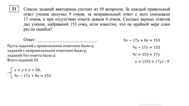 Задание 21. Список заданий викторины состоял из 50 вопросов. За каждый правильный ответ ученик получал 9 очков, за неправильный ответ с него списывали 17 очков, а при отсутствии отвела давали 0 очков. Сколько верных ответов дал ученик, набравший 153 очка, если известно, что по крайнее мере один раз он ошибся? Курс по всем заданиям 1 - 21 базового уровня ЕГЭ по математике: https://stepik.org/a/174709 Курс по заданиям 21 из базового уровня ЕГЭ по математике: https://stepik.org/a/187368 Группа ВК: https://vk.com/secretroom2023 #егэ #математика #база