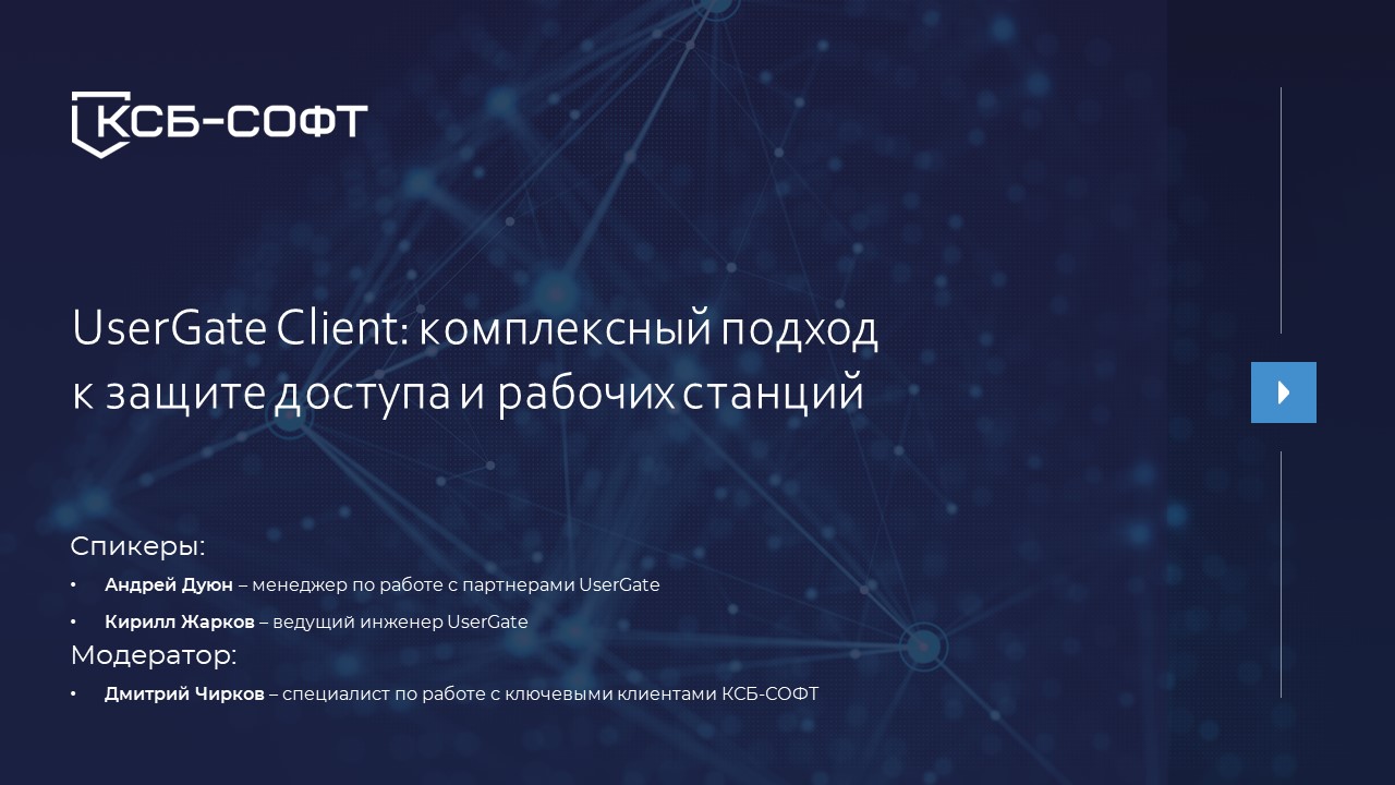 Вебинар 30.01.2024 Ключевые вопросы: • режимы работы UserGate Client; • VPN; • проверку состояния конечной станции с помощью NAC; • управление доступом пользователей; • аналитику и реагирование на инциденты ИБ на конечной станции.