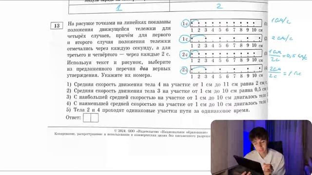 На рисунке точками на линейках показаны положения движущейся тележки для четырёх случаев - №20997