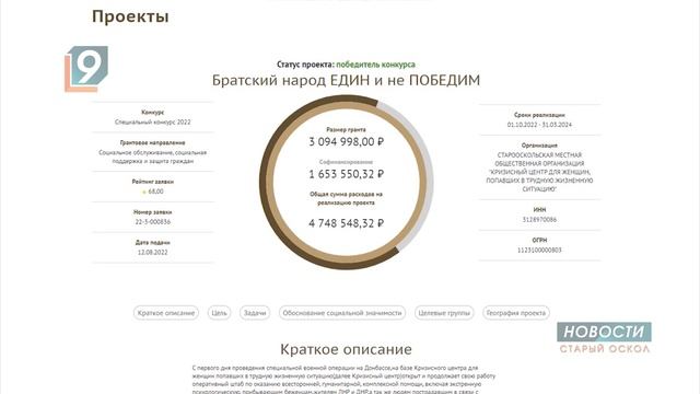 На первом и втором - Ростовский регион и Башкортостан. Конкурс был внеочередным из-за большого количества инициатив по поддержке пострадавших на Донбассе. На это было выделено 2 млрд рублей из резервного фонда президента Владимира Путина. 121 из почти 500 проектов будет реализован на территориях Донецкой и Луганской народных республик, Запорожской и Херсонской областей. Местные жители получат гуманитарную помощь, там будут работать медики, психологи, реабилитологи, добровольцы, помогающие сделать срочный ремонт, подготовиться к зиме. В Белгородской области реализуют 20 инициатив. Всего один из проектов - старооскольский. 3 миллиона рублей из фонда президентских грантов и еще более полутора миллиона софинансирования получит Кризисный центр для женщин, попавших в трудную жизненную ситуацию. Здесь уже 8 месяцев работает оперативный штаб по оказанию всесторонней помощи беженцам, жителям ЛНР и ДНР, а так же старооскольцам, пострадавшим в связи с экономическим кризисом из-за введенных санкций.