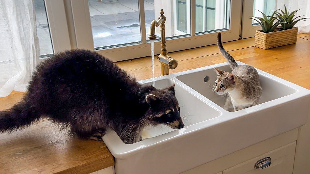 КОТЫ И ЕНОТ ЗНАКОМЯТСЯ НА НОВОЙ КВАРТИРЕ / Барханная кошка недовольна проделками енота