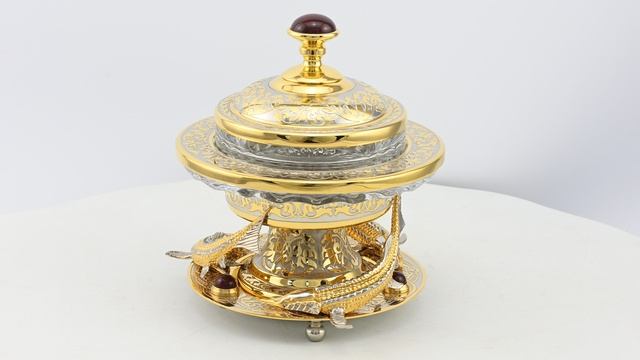 •Материалы: бронза, латунь, яшма, хрусталь. •Содержание драгоценных металлов: никель - 20мкм, золото (999,9)-5мкм. •Техника исполнения: токарные работы по металлу, обкатка и пресовка металла, ручная рисовка, травление, гравирование иглой, гравирование резцом, ручная подрезка, никелирование, золочение, ювелирные работы, токарные работы по камню. •Объем 130 мл. •Вес изделия 1220гр.