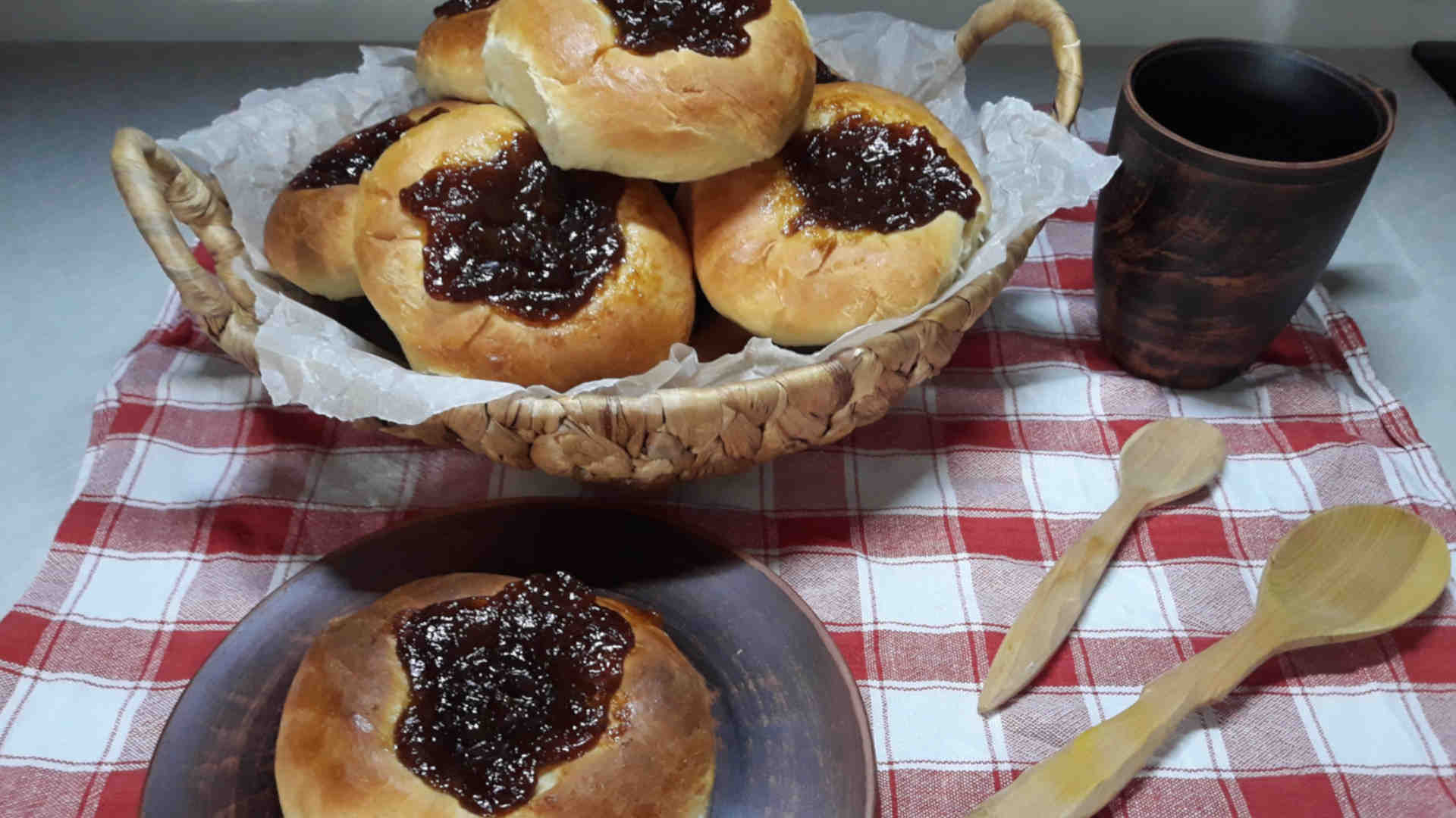 Нам понадобится: 1. Молоко – 280мл 2. Сахар - 4 ст. л. 3. Дрожжи (я использовала быстродействующие универсальные Dr. Oetker) – 11г 4. Мука – 550г 5. Яйцо - 1шт. 6. Сливочное масло – 70г 7. Соль – 1 ч. л. We will need: 1. Milk – 280ml 2. Sugar-4 tbsp 3. Yeast (I used fast-acting universal Dr. Oetker) - 11g 4. Flour – 550g 5. Egg-1 pc. 6. Butter-70g 7. Salt – 1 tsp. Молоко без специальной подготовки (называемой на научном языке темперированием) желательно вообще не использовать в выпечке. Я сначала довожу молоко до кипения (не кипячу, а просто довожу), затем ставлю молоко в духовку на 30 минут на температуру 90°. Многие люди делают выпечку на совершенно неподготовленном молоке и возможно считают, что на конечный итог это плохо никак не влияет. Вот здесь еще раз подчеркну этот момент и все таки еще раз порекомендую , попробовать молоко т е м п е р и р о в а т ь. Вы увидите колоссальную разницу! Также можно использовать ультрапастеризованное молоко, если не хотите тратить время на темперирование. - В тёплое молоко, не горячее, ведь от высоких температур дрожжи погибают, температура жидкости не должна превышать 38 градусов, добавьте 4 ст. л. сахара, 11г дрожжей, 1 ч. л. соли, перемешиваем и начинаем добавлять потихоньку муку. Сначала замешиваем тесто ложкой, а когда станет затруднительно вымешивать ложкой начинаем это делать руками. – Затем добавляем 1 яйцо, 70г растопленного сливочного масла и замешиваем мягкое эластичное тесто. Миску закрываем полотенцем или крышкой и оставляем тесто в теплом месте на 1,5 часа. - Через 1,5 часа выкладываем тесто на присыпанный мукой стол и делим его на 12 равных частей, делаем из каждого кусочка шарик. - Берем каждый шарик и раскатываем его в небольшую лепешку. - Далее, по центру каждой лепешки делаем углубление и заполняем их повидлом. У меня было домашнее сливовое повидло. - Все ватрушки с повидлом выкладываем на противень, покрытый пергаментом. Пергамент я смазываю растительным маслом, накрываем ватрушки полотенцем и оставляем на 20 минут для расстойки. – Через 20 минут смазываем наши ватрушки яичным белком и отправляем их в разогретую до 200 градусов духовку на 15-20 минут. Повидло обязательно должно быть густым, иначе оно у вас убежит в процессе выпечки. Если повидло недостаточно густое, можно добавить к нему крахмал или агар-агар и проварить, дать остыть и начинять ватрушки. Наши ватрушки с повидлом готовы!!! Приятного аппетита!!!???