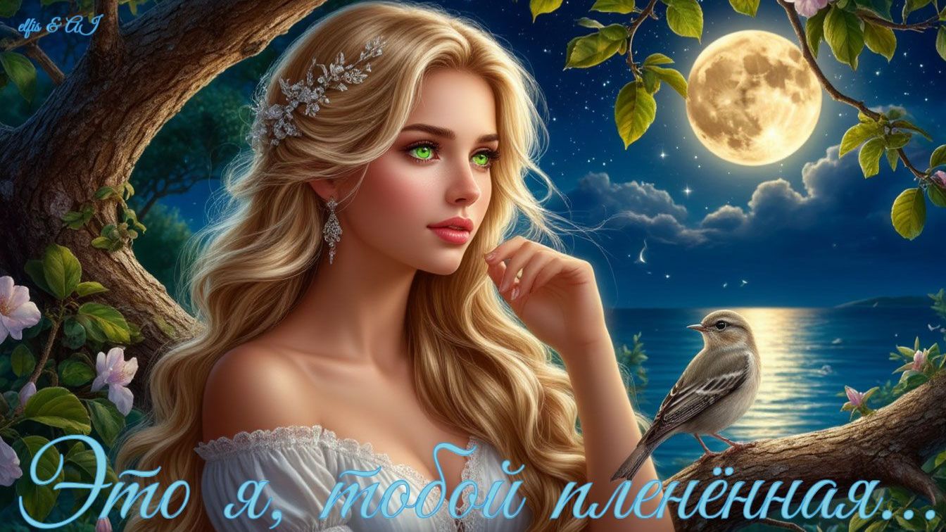 Это я — тобой пленённая!..✨👸🏼💞🌕✨ ~***~ Это я — тобой пленённая... И в саду мне певчий дрозд в полнолуние бессонное песни дарит в свете звёзд... Вновь душа полна туманами... и по утренней росе побежит любовью пьяная по прибрежной полосе... слушать моря шёпот ласковый, так похожий на стихи, на твои подарки царские — вдохновенный целый мир!.. Это я — тобой пленённая... И в саду мне певчий дрозд в полнолуние бессонное песни дарит в свете звёзд... В полнолуние бессонное льётся песенный мотив... Это я тобой пленённая!.. Никуда мне не уйти. ~~~~~~~~~~~~~~~~~~~~~~~~~~~~~~~~~~~~~~~~~~~~~~~~~~ © Copyright: Надежда Бурцева -4, 2012 Свидетельство о публикации №11210308190 Стихи, промт, мастеринг песни: Надежда Бурцева elfis Музыка, вокал, иллюстрация: ИИ Авторский коллаж и промт к картинке Надежды Бурцевой