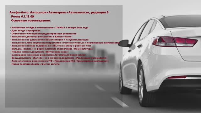 В обзоре рассказывается об изменениях в программе, выпущенных в релизе 6.1.13.09 Список изменений доступен по ссылке: https://rarus.ru/forum/forum7/topic13932/?PAGEN_1=3#message97312 Тайм-коды: 00:00:06:42 - 71820: Изменения по НДС в соответствии с 176-ФЗ с 1 января 2025 года 00:04:35:59 - 72430: Дата ввода маркировки 00:05:21:37 - 72156: Отключение блокировки редактирования реквизитов 00:07:20:50 - 73238: Заполнение договора контрагента в Клиент-банке 00:07:34:19 - 70358: Заполнение по документу в Комплектации и Разукомплектации 00:08:07:34 - 72688: Заполнение Акта сверки взаиморасчётов с учетом головных и подчиненных контрагентов 00:09:02:22 - 72304: Заполнение номера телефона из события в заявку и рабочий лист 00:09:42:58 - 71590: Вкладка «Заказы» в форме элемента справочника «Номенклатура» 00:09:57:03 - 73335: Подбор замен во Внутреннем заказе 00:10:16:40 - 73294: Блокировка ключевых реквизитов Автомобиля после записи 00:10:53:45 - 72734: Ввод документа «Жалоба» на основании документа «Реализация автомобиля» 00:11:31:13 - 72710: Автозаполнение реквизитов в ПФ «Приложение №4 (Транспортная накладная)» 00:12:16:50 - 72966: Новая печатная форма «Счет на оплату» Зарегистрированные пользователи, имеющие действующую технологическую поддержку, могут скачать обновление в личном кабинете: https://rarus.ru/my/ Статьи и инструкции по использованию программного продукта Альфа-Авто: Автосалон+Автосервис+Автозапчасти Корп, редакция 6, можно найти на сайте: https://rarus.ru/kb/samouchitel-alfa-avto/ Программы для автосалонов, дилерских центров, дилерских сетей - https://rarus.ru/1c-auto/alfa-avto-avtosalon-avtoservis-avtozapchasti-korp-redaktsiya-6-dlya-20-polzovateley-programmnaya-zashch/ Программы для автосервисов, технических центров - https://rarus.ru/1c-auto/alfa-avto-avtoservis-avtozapchasti-prof-redaktsiya-6-dlya-5-polzovateley-programmnaya-zashchita/ Дополнения для Альфа-Авто, редакция 6 - https://rarus.ru/1c-auto/dopolneniya-alfa-avto/