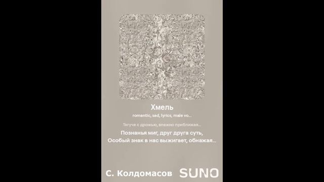 Лирика. Текст - С. Колдомасов Аудио и визуал - Suno AI Стихи: Сергей Колдомасов - "Хмель" (2020/07/11) (на сайте стихи.ру). Никакой вульгарщины или пропаганды, все совпадения чисто совпадения!