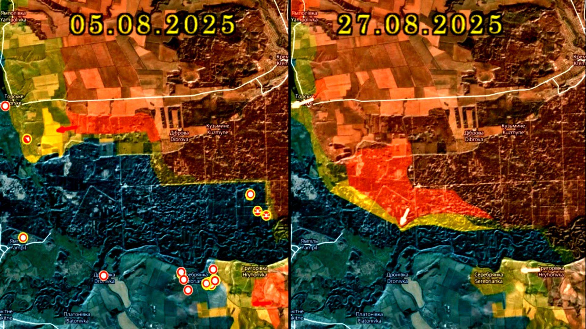 Карта боевых действий за Серебрянское лесничество с 5 по 27 августа 2025 года
