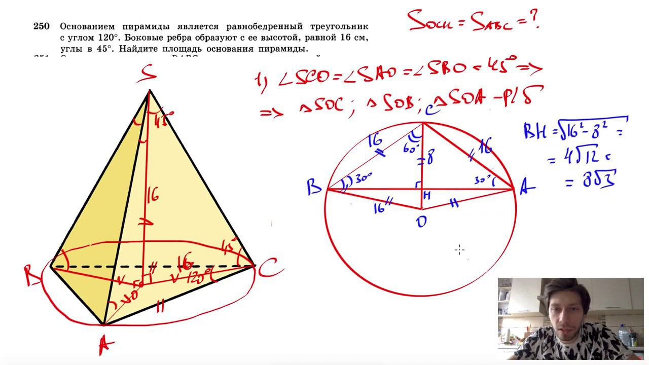 №250. Основанием пирамиды является равнобедренный треугольник с углом 120°. Боковые ребра образуют с ее высотой, равной 16 см, углы в 45°. Найдите площадь основания пирамиды. Поддержать канал рублём - 5469400944002125 (Сбербанк) Мой второй канал для подготовки к ЕГЭ и ОГЭ - https://www.youtube.com/ЕвгенийСумин Инстаграм - https://www.instagram.com/EGE_OGE.math Личный инстаграм - https://www.instagram.com/ee_sumin VK - https://vk.com/evgeniysumin FB - https://www.facebook.com/EvgeniySumin