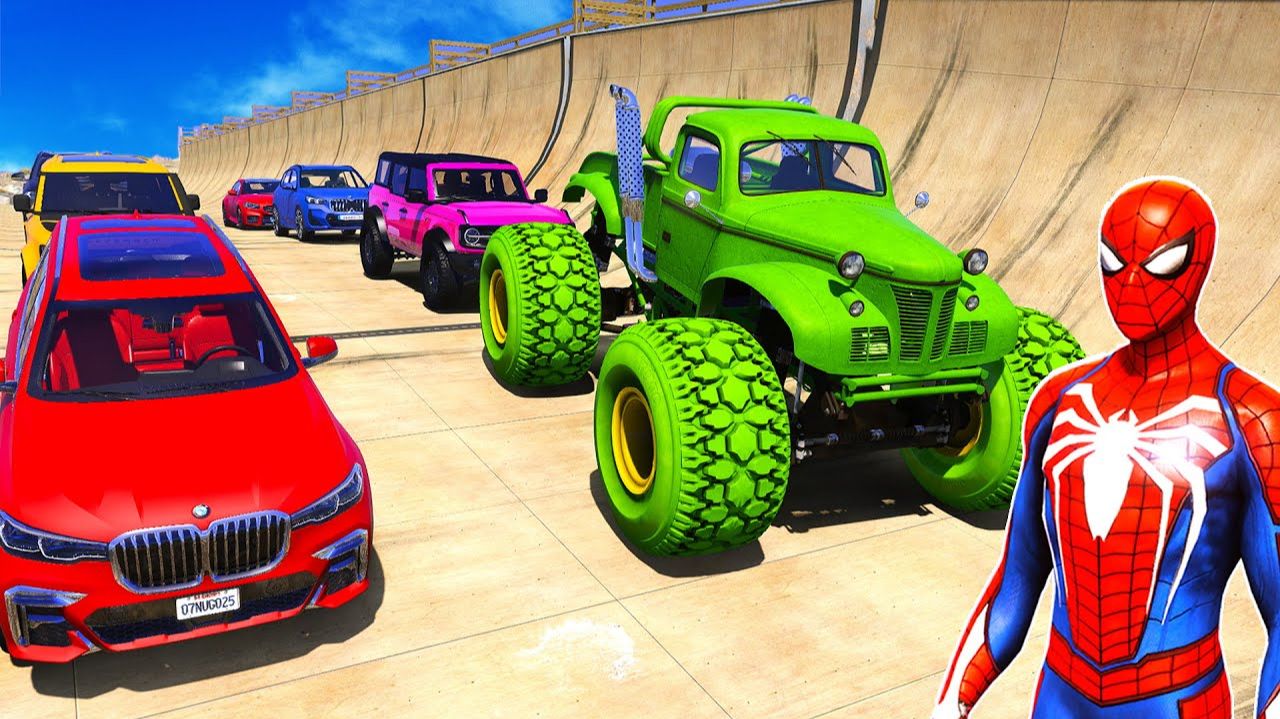 Человек-паук Супер гонки на спортивных машинах Вызов мега мульти рампы Супергерои Гонка на Джипах